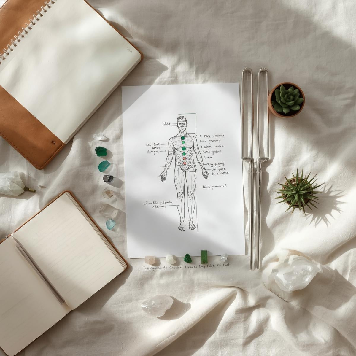 Receive a comprehensive remote report using crystals and tuning forks on a symbolic figure.
